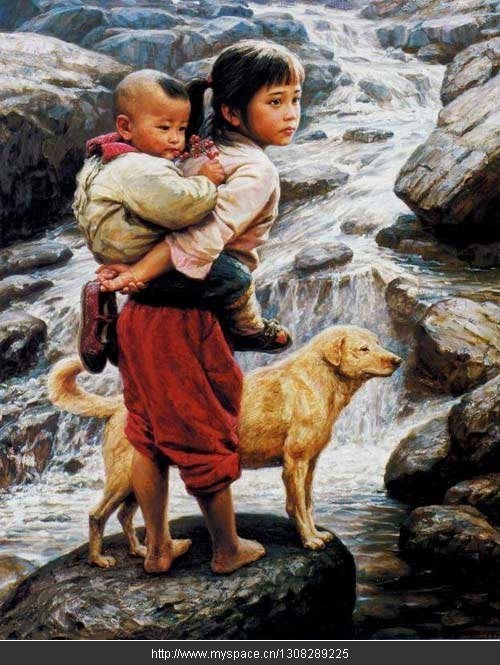 姐姐在给弟弟喂饭,还要吹一下,以免烫伤,在农村,以大带小,是最常见的,最纯洁的兄妹(弟)情谊,血浓于水的感情啊,大概今天独生子女很难想象……