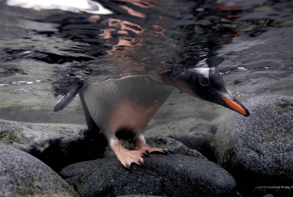这只年轻的巴布亚企鹅正在南极半岛拉可罗港口水域中窥探海豹的行踪。