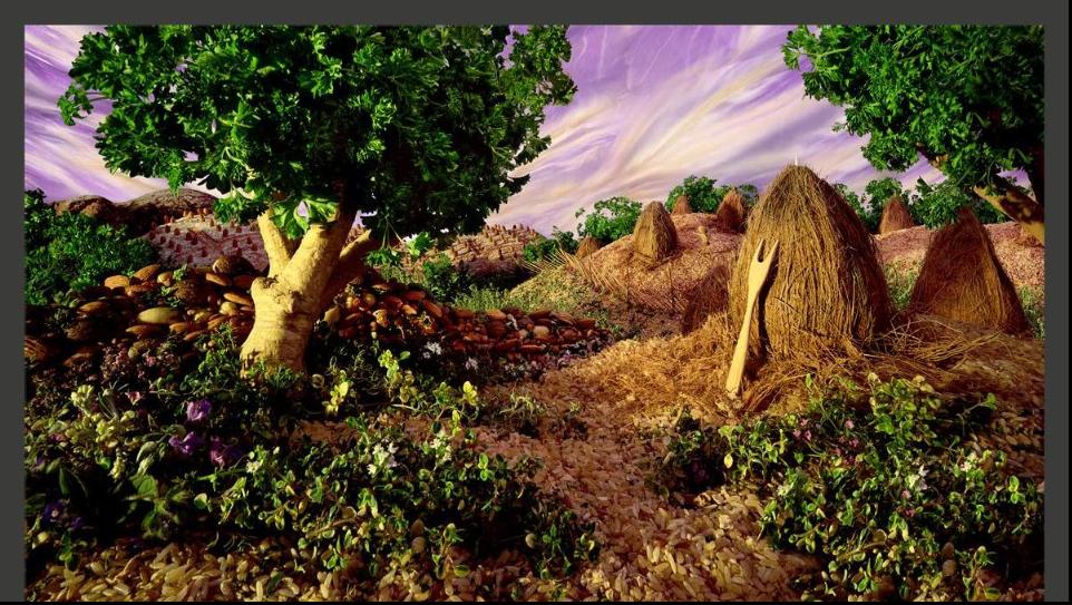 在森林中,樹是以甘藍做成並吊著豆子當作果實,以及以小茴香鋪成的道路。草皮是用香料做成而山則用麵包,雲由花耶菜做成點綴了天空。