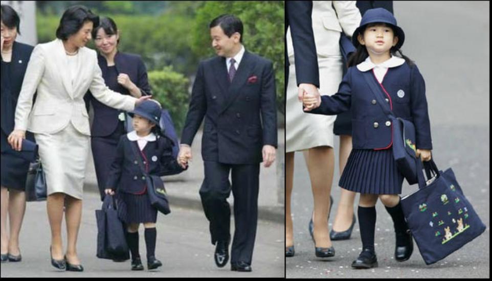 日本皇太子妃小和田雅子與皇太子德仁陪同小公主愛子參加幼稚園入園儀式。下雨天也是孩子自己拿包包。